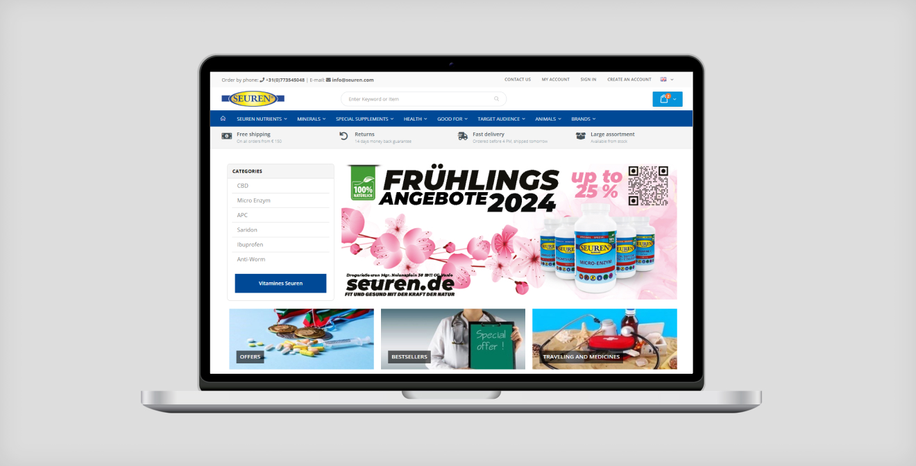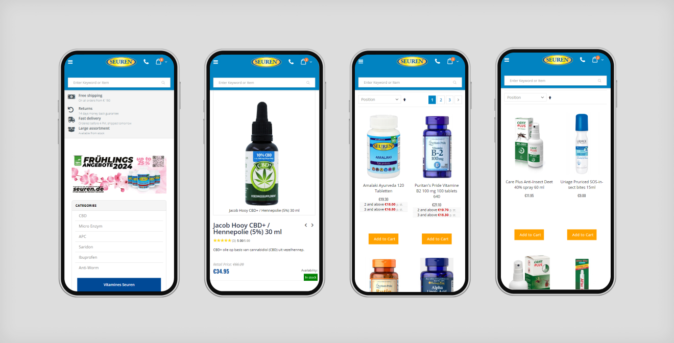 SeurenHealth, a prominent drugstore based in Venlo and established in 1977, specializes in vitamins, minerals, medicines, and homeopathy. To align with evolving digital commerce standards, SeurenHealth sought to upgrade its e-commerce platform. The project focused on optimizing mobile category menus, enhancing product page tab navigation, integrating ShipperHQ for advanced shipping solutions, and implementing third-party review functionality to bolster product credibility.